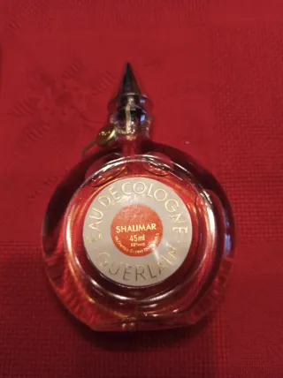 Flacone di profumo Eau de Cologne Guerlain Shalimar. Raro ml 45 - Design rotondo in vetro trasparente. - Tappo dorato a punta. - Etichetta circolare con scritte EAU DE COLOGNE GUERLAIN.