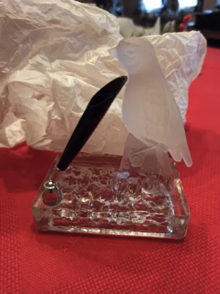 Elegante porta penna da scrivania, perfetto per organizzare la tua postazione. Alto 12 cm - Realizzato in vetro trasparente con finitura satinata. - Decorato con una graziosa statuetta di uccellino. - Base in vetro lavorato.