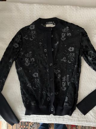 Elegante cardigan ALMA con un delicato motivo floreale. - Tessuto trasparente con stampa floreale. - Chiusura con bottoni. - Collo e fondo a costine.
