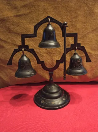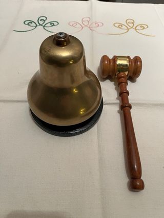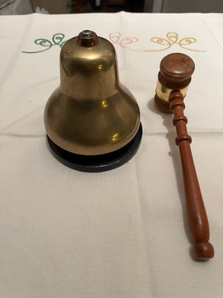 Elegante campana da tavolo con base. per riunioni condominiali o aziendali con battacchio - Materiale: bronzo e legno. - Colore: oro e marrone.