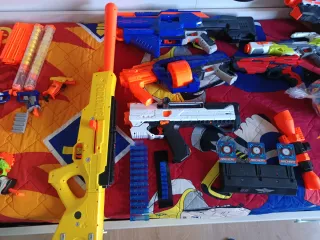Set di pistole Nerf con vari accessori, in buone condizioni. - Pistole Nerf di diversi modelli. - Caricatori e munizioni incluse. - Accessori aggiuntivi per il gioco.
