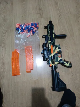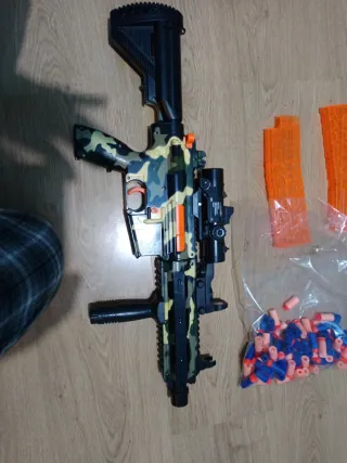 Fucile elettrico in mimetica con accessori. - Caricatori arancioni. - Munizioni colorate (blu e arancioni).