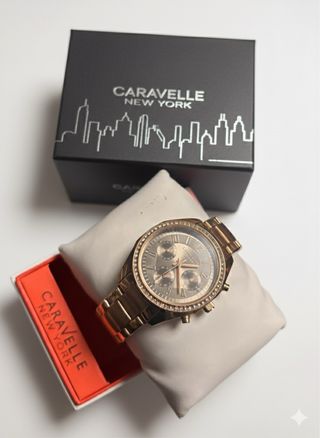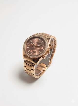 Elegante orologio da polso da donna. - Cassa e bracciale in finitura oro. - Lunetta impreziosita da cristalli. - Quadrante con indici romani e dettagli cronografici.