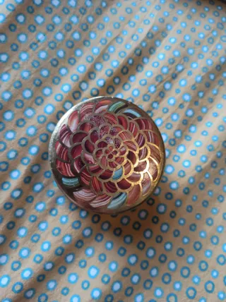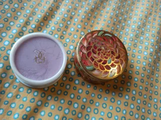 Bellissima cipria vintage Guerlain con una decorazione floreale dorata e colorata. Un pezzo da collezione. - Decorazione a spirale con dettagli dorati. - Tonalità di rosso, oro e verde acqua.