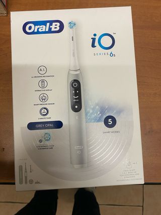 Spazzolino elettrico Oral-B iO Series 6S, colore Grigio Opale. Dotato di intelligenza artificiale per un'esperienza di pulizia personalizzata. - Riconoscimento spazzolamento AI. - Display interattivo. - Sensore di pressione intelligente. - Timer di 2 minuti. - 5 modalità di pulizia. - Include 1 testina iO Ultimate Clean e 1 testina iO Gentle Care. - App Oral-B con coaching personalizzato.