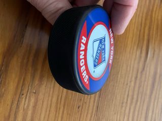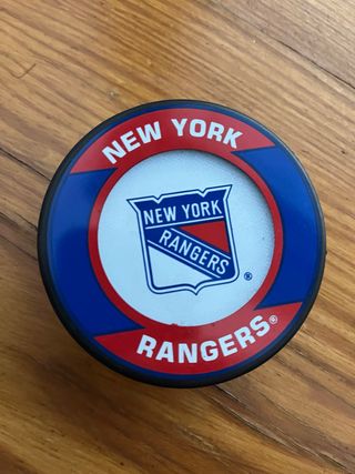 Disco da hockey con il logo dei New York Rangers. - Design ufficiale della squadra. - Colori blu, rosso e bianco.