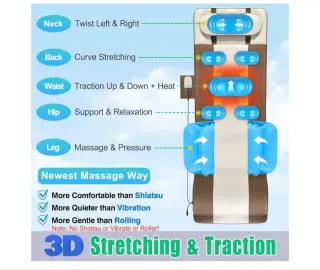 Tappeto massaggiante Comrelax per un massaggio completo del corpo. Design 3D stretch. Adatto per persone da 155 a 183 cm Utilizzo su letto, divano o pavimento Pieghevole, con velcro e maniglia Tappetino Massaggio Corporeo 3D con Calore Tappetino di massaggio per corpo completo con stiramento corporeo 3D e trazione lombare. Progettato per rilassare schiena, collo, vita e fianchi in modo delicato, silenzioso e confortevole. Funzioni: Stiramento su/giù e sinistra/destra Trazione lombare e supporto della schiena Riscaldamento con 3 livelli di calore Massaggio NON shiatsu, NON vibrazione, NON rulli