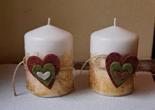 Set di tre candele decorate con cuori in tessuto e dettagli dorati. - Decorazione a forma di cuore sovrapposto in diverse tonalità. - Rifiniture in corda di juta. - Base glitterata color oro.