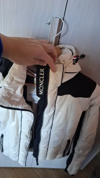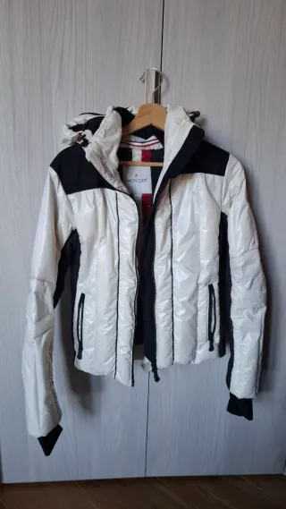 Giacca da sci Moncler da donna, perfetta per le piste. - Colore bianco lucido con inserti neri. - Cappuccio. - Zip frontale ( leggermente sciupata dal tempo sui bordi ma perfettamente funzionante ). - Guantini neri senza dita neri. - Pulisci- occhiali da sci inserito all'interno. - Usato pochissime volte, mai per sciare.