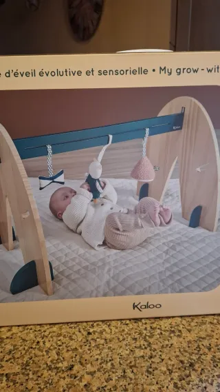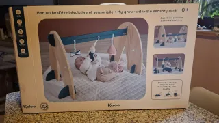 Arco attività Kaloo per neonati, ideale per stimolare i sensi. - Struttura in legno. - Tessuti morbidi e colorati. - Include diversi giochi pendenti.