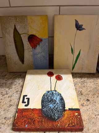 Set di tre quadretti decorativi con motivi floreali astratti. - Composizione artistica con texture materica. - Raffigurazioni di fiori stilizzati. - Ideali per aggiungere un tocco di colore e arte a qualsiasi ambiente.
