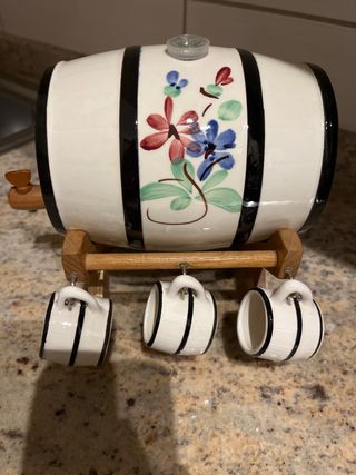 Set composto da una botte decorata con fiori e sei bicchierini abbinati. - La botte presenta una finitura bianca con fasce nere e decorazioni floreali. - I bicchierini sono bianchi con dettagli neri. - La botte è supportata da una base in legno.
