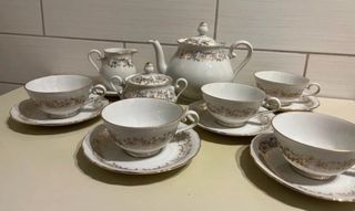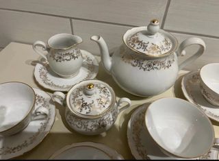 Elegante servizio da tè in porcellana, perfetto per ogni occasione. Questo set aggiunge un tocco di raffinatezza alla tua tavola. - Decorazioni floreali in oro. - Include teiera, zuccheriera, lattiera e tazze con piattini. - Design classico e intramontabile.