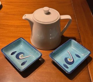 Set composto da una teiera e due piattini decorati. - Teiera in ceramica bianca. - Due piattini quadrati con decorazione blu e gialla.