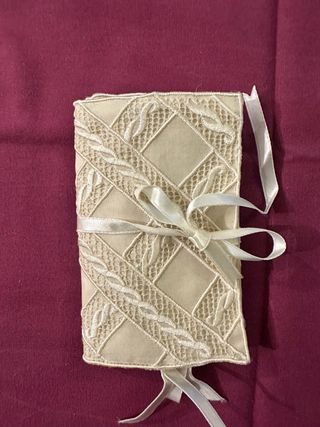 Elegante portagioie da viaggio con dettagli in pizzo. - Colore avorio con finiture in pizzo. - Chiusura con nastri. - si chiude in 3 parti, con 2 tasche chiuse con cerniera e porta anelli. ideale da viaggio o da tenere in borsetta. idea regalo aperto cm 21 x 11, chiuso cm 7 x 11