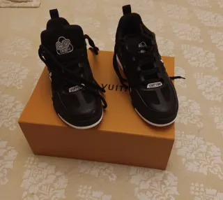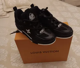 Ottima idea per regalo natalizio. Louis Vuitton scarpe originali uomo in pelle nera taglia 44,5 con logo colore bianco, usate solo tre volte. In condizioni perfette condizioni la sua scatola e custodia in pannetto per scarpe marcate LV