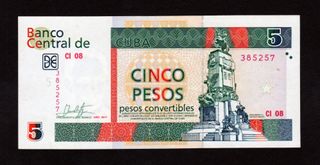 CUBA 5 PESOS COVERTIBLES CUC 2017 XF/EBC- Pick.FX48g Serie 385257 Alfa CI-08. Banconota da 5 pesos convertibles di Cuba, emessa nel 2017. - Denominazione: 5 pesos convertibles. - Anno di emissione: 2017. - Stato di conservazione: XF/EBC- (Extremely Fine / Escellente Bellissimo -)