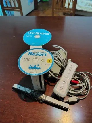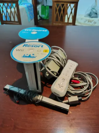Console Nintendo Wii bianca, completa di tutti i suoi accessori originali e due giochi. - Console Wii - Wii Sports - Wii Sports Resort - Controller Wii - Sensore Wii - Cavi di alimentazione e AV