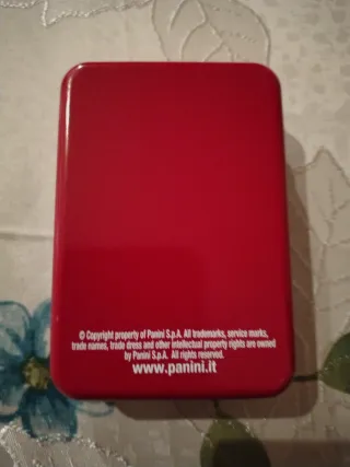 Scatola di latta da collezione Panini, ideale per conservare figurine o piccoli oggetti. - Design a tema calcistico con immagine di un giocatore. - Logo Panini ben visibile. - Bordi arrotondati e finitura lucida.