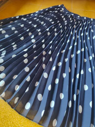 Gonna plissé blu a pois bianchi, con elastico in vita, foderata. Pennyblack. Ottime condizioni. Taglia L, misure: Vita 36 cm Lunghezza 51 cm