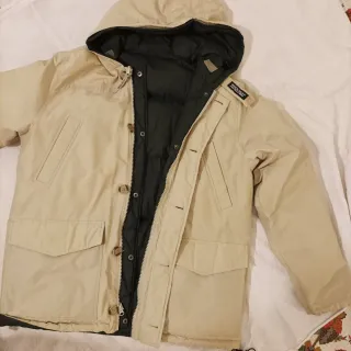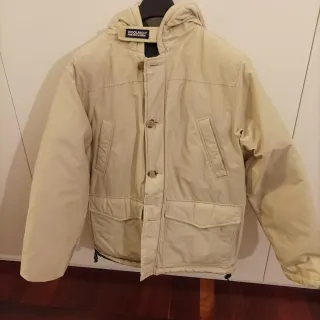 Giaccone da uomo originale Woolrich, modello Artic Parka. 70% piumino e 30% piuma. Classico colore beige / REVERSIBILE verde molto scuro. Con cappuccio (pelo removibile), chiusura con zip + bottoni, tasche su entrambi i lati e coulisse al fondo. PRATICAMENTE NUOVO. Taglia L - misure: Spalle 50 cm Torace 62 cm Lunghezza manica 72 cm