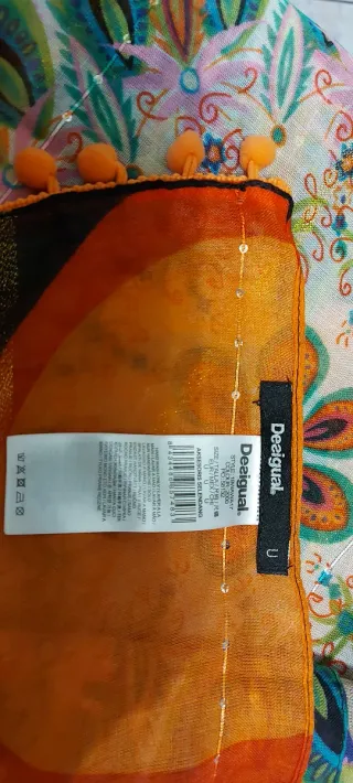 Foulard Desigual con un vivace design. - Fantasia con cerchi concentrici e motivi floreali. - Dettagli metallici dorati. - Orlo con frange arancioni.