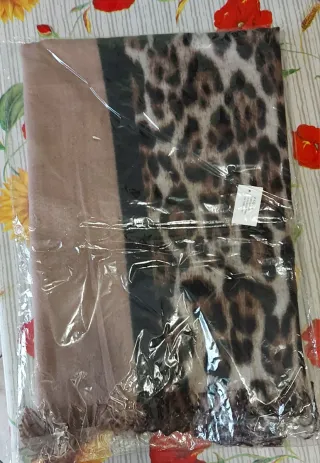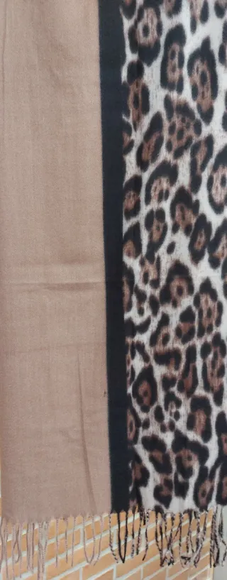 Sciarpa da donna meta' marron e meta'con stampa animalier marrone e beige con frange. Composizione 80% viscosa 20% lana. Misure 70x 182 Mai indossata