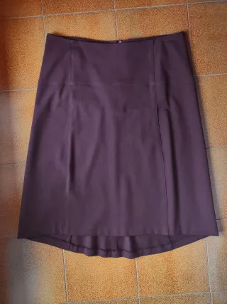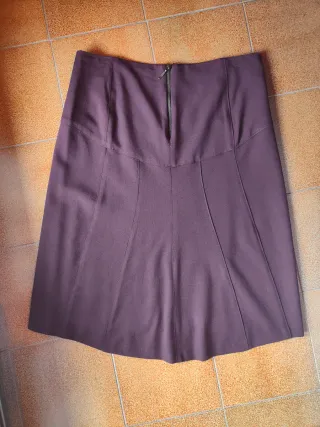 Gonna realizzata a mano, modello aderente sui fianchi e poi svasato, adatta a tutti i tipi di conformazione perché snellisce la silhouette. Arriva sopra al ginocchio ed è leggermente più lunga dietro. Sfoderata, bellissimo tessuto elasticizzato, con zip sul dietro. Colore prugna/bordeaux. Praticamente nuova. Taglia 42 - misure: Vita 38 cm Bacino 47 cm Lunghezza davanti 53 cm