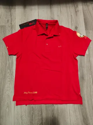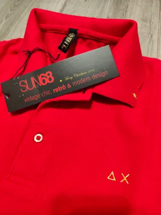 Polo in cotone rossa, "Sun68" unisex, edizione natalizia. Ricami color oro e stampa dorata nel sotto collo. Particolari a taglio vivo e finti buchi sullo scollo. Mai indossata, con sacchetto. Tg.M - misure: Spalle 42 cm Torace 51 cm Lunghezza da spalla davanti 62 cm