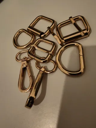 Set di accessori in lega metallica, colore oro: - 2 fibbie a rullo con ardiglione, luce 25 mm - 1 fibbia quadrata con barra, luce 20 mm - 2 anelli a D, luce 25 mm - 2 moschettoni con anello, luce 18 mm Resistenti a usura e ossidazione, ideali per realizzare o riparare borse, zaini, portachiavi, accessori in pelle, collari per animali domestici.
