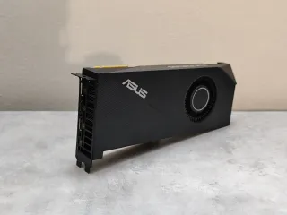 Scheda video ASUS 2080 Ti con 11GB di memoria. - Design elegante e compatto. - Ventola singola per un raffreddamento efficiente. - Logo ASUS in rilievo sul lato.