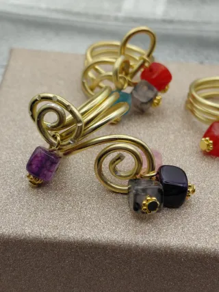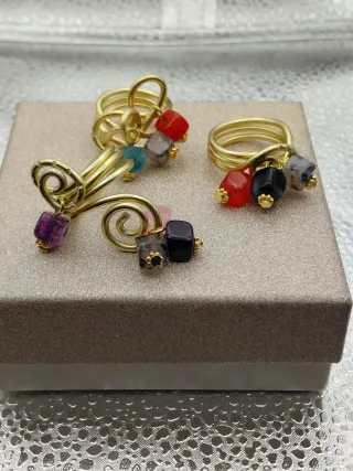 Anelli con un design unico e pietre colorate che aggiungono un tocco di vivacità.Hanno una misura standard su 18/19 ma facilmente si possono regolare - Finitura dorata. - Pietre sfaccettate. - Stile boho-chic.