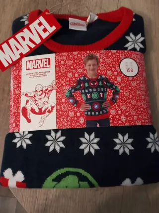 Maglione a tema Marvel per bambini, taglia 158. Presenta un design natalizio con personaggi iconici. - Personaggi Marvel inclusi: Spiderman, Captain America, Hulk. - Design a tema natalizio con fiocchi di neve. - Colore blu scuro con dettagli rossi.
