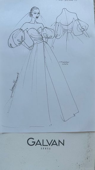 Schizzo di un abito da sposa GALVAN SPOSA. - Design con maniche a sbuffo. - Scollo a cuore. - Gonna ampia e fluida. - Dettaglio drappeggiato sul corpetto. - Include schizzo del retro.