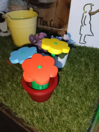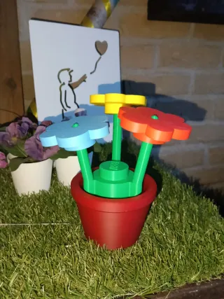 Set di fiori colorati in stile Lego, perfetti per decorare o per giocare. - Fiori rossi, blu e gialli. - Vaso rosso incluso.