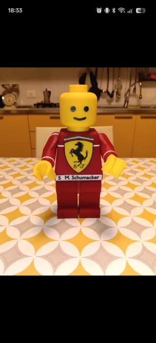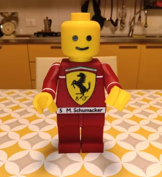 Riproduzione della minifigura Lego di Michael Schumacher con la tuta Ferrari. - Design ispirato alla Formula 1. - Dettagli del cavallino rampante Ferrari. - Numero 5 e nome Schumacher stampati.