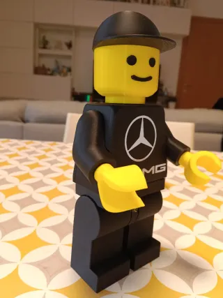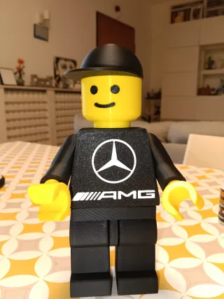 Riproduzione di una minifigura Lego a tema Mercedes AMG. - Testa gialla con espressione sorridente. - Cappellino nero. - Corpo nero con logo Mercedes e scritta AMG.
