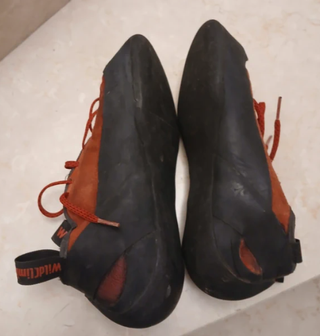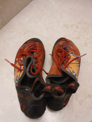 Scarpette da arrampicata Wild Climb modello Pantera. - Taglia 40.5. - Colore arancione con dettagli gialli e blu. - Lacci rossi. - Logo Wild Climb sul cinturino.