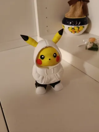 Statua di Pikachu con felpa bianca e pantaloni neri. - Dettagli rossi sulle guance. - Orecchie gialle con punte nere. - Scarpe bianche.