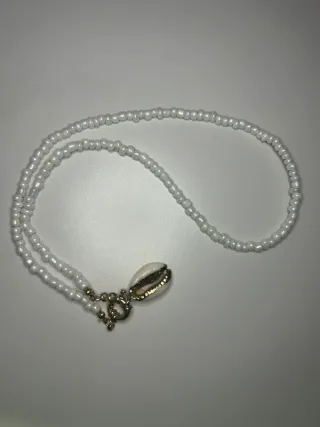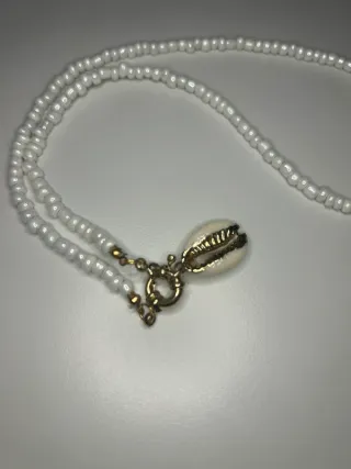 Collana fatta a mano con perline bianche. Chiusura in oro con conchiglia.