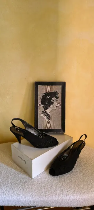 Eleganti scarpe slingback nere. 239.000 lire - Materiale suola in cuoio " made in Italy", sottopirde cuscinetto morbido, tomaia con inserti pizzo nero - Tacco 6 cm, modello Chanel confort ( slingback attuale) - Cinturino alla caviglia. Numero 39. La suola presenta leggeri segni d'usura.