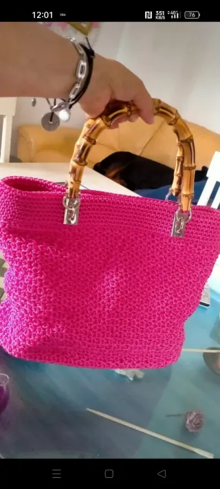 Borsa interamente realizzata a mano, perfetta per completare ogni outfit. - Manici in bambù. - Dettagli metallici argentati.