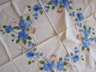Elegante tovaglia rotonda con un motivo floreale blu e cestini. - Set composto da 8 tovaglioli coordinati. - Decorazione con fiori blu e dettagli in cestino.