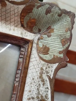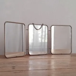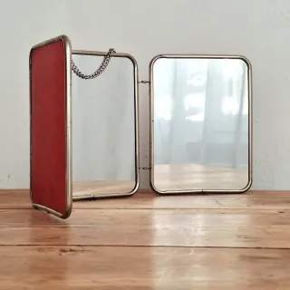 Trittico da barbiere vintage in metallo nichelato, con tre ante pieghevoli e catena originale. Linee essenziali ed elegante patina del tempo, che ne valorizza il carattere autentico. Gli specchi sono in buone condizioni, con normali segni d’uso; il retro rosso presenta alcune macchie visibili in foto. Un oggetto d’epoca sobrio e raffinato, ideale come dettaglio decorativo in ambienti vintage o contemporanei. 📏 Misure: - Ogni anta: 15 × 19,5 cm - Apertura totale: 48 cm