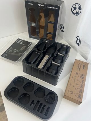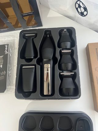 Set completo per la cura personale, ideale per capelli, barba e corpo. - Include diversi accessori per varie esigenze di styling. - Base di ricarica e supporto per accessori. - Design moderno e funzionale.