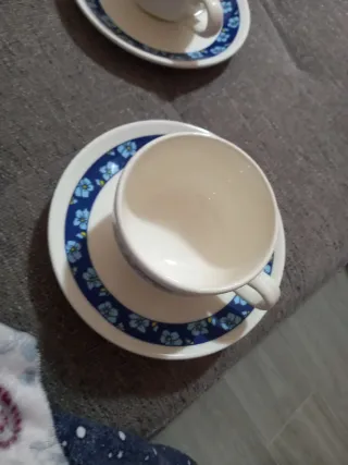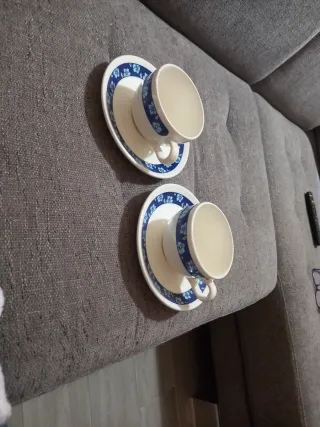 Elegante set di due tazze con i rispettivi piattini, perfetti per ogni occasione. - Design floreale blu su sfondo beige. - Realizzati in ceramica e porcellana di alta qualità.