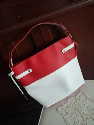Borsa a mano con un design bicolore che combina il rosso e il bianco. Nuova come acquistata in negozio Molto capiente ( misure in foto) Tracolla regolabile - Manico singolo. - Dettagli in metallo. - Chiusura con zip.