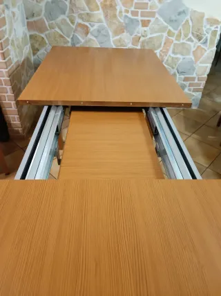 Tavolo da pranzo in legno con possibilità di allungamento per ospitare più persone. - Piano in legno con finitura effetto venatura. - Meccanismo di allungamento a scomparsa.