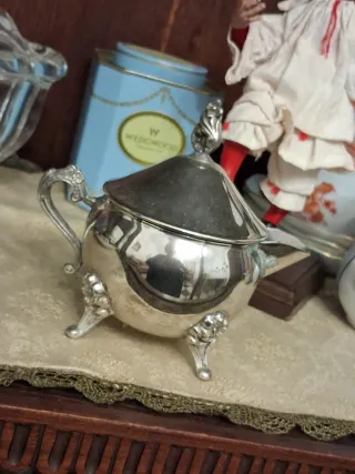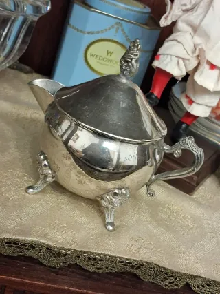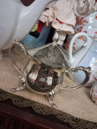 Elegante zuccheriera vintage in metallo argentato, perfetta per aggiungere un tocco di classe alla tua tavola. Presenti segni del tempo che nulla tolgono al fascino dell oggetto - Design classico con coperchio e manici. - Piedini decorativi.