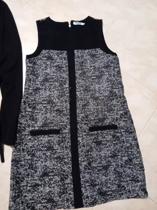 Lotto composto da sei capi di abbigliamento per bambina, taglia 10 anni. - Un cardigan nero. - Un abito nero e grigio con fantasia. - Quattro capi aggiuntivi inclusi nel lotto.